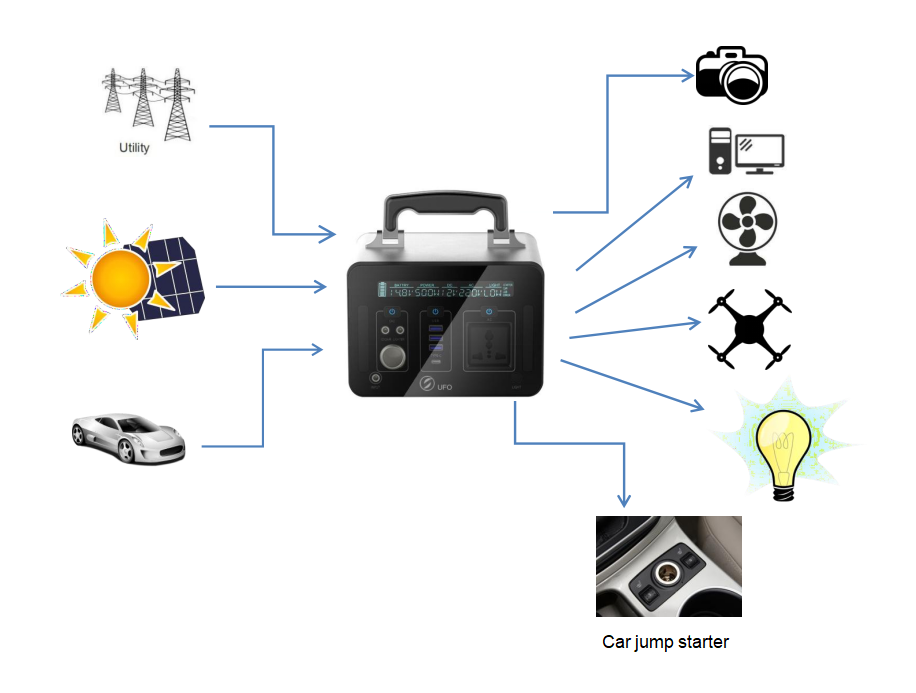 Ciò è rifornimento portatile multifunzionale. Nel caso di interruzione di corrente o di voi debba fare pagare su un viaggio, potete temporaneamente incaricare i vostri dispositivi elettrici o digitali di questa unità. Questa unità può fornire l'uscita di USB, di CC e di CA. Potete tenere i computer portatili, apparecchi, luci ed andando per ore e ore più lungo.